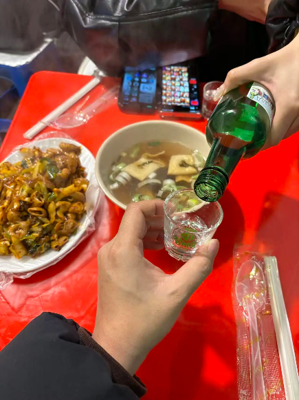 很多人不理解韩国人为什么偏爱“真露”这款酒,平日里喜欢小酌一杯的朋友大概都不喜爱它的“工业酒精味”。真露虽然入口酌之浅浅,但配搭爽口的啤酒,便成为韩国人经典的聚餐搭子“烧啤”。后劲十足的“烧啤”,令人微醺着走进首尔的夜晚。